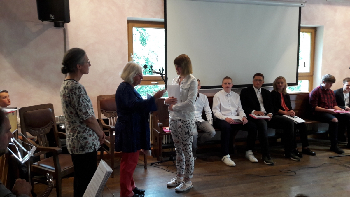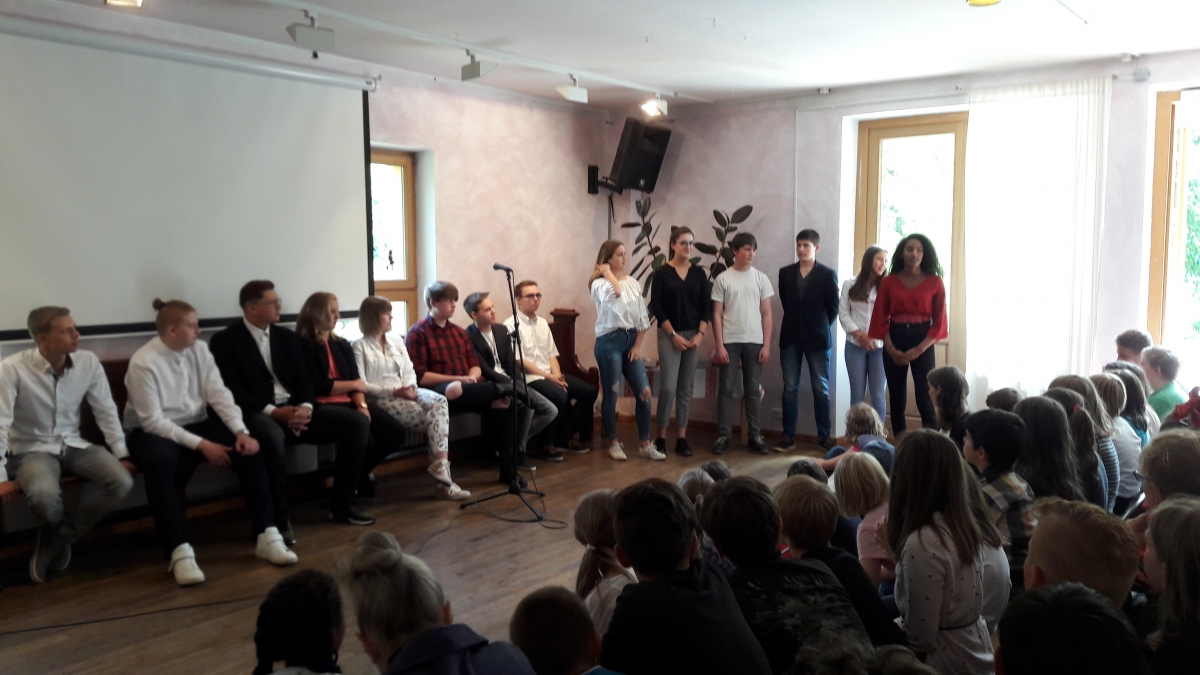 „Alles richtig gemacht.“ Unter diesem Motto verabschiedete die Klassenlehrerin Frau Schenk mit einer Rede die Schülerinnen und Schüler des 11. Jahrgangs. Zwei Mädchen, Merle Friedrich und Marie-Louise Suttmann, und sechs Jungen, Julius Bär, Jannis Binczyk, David Gerz, Lukas Kirchner, Christoph Laukant und Jonah Luca Sieber wurden am Donnerstag von den Lehrerinnen und Lehrern und von allen Klassen feierlich verabschiedet. Wie jedes Jahr bildete ein musikalisches und literarisches Programm den Rahmen dieser Feierstunde. Von der 1. bis zur 10. Klasse hatten sie sich etwas Besonderes einfallen lassen. So wurden Gedichte und Sketche vorgetragen, Klavierstücke gespielt und Lieder gesungen. Den Höhepunkt bildete natürlich die feierliche Übergabe der Abschlusszeugnisse. Alle hatten ihr Traumziel erreicht und werden jetzt auf weiterführende Schulen wechseln, auf Berufskollegs in Lüdenscheid und Iserlohn oder in die gymnasiale Oberstufe der Gesamtschule. Zum Schluss sangen alle gemeinsam das Abschiedslied „Mögen die Straßen uns zusammen führen“ verbunden mit der Hoffnung, dass die Abgänger der Schule weiter treu bleiben.