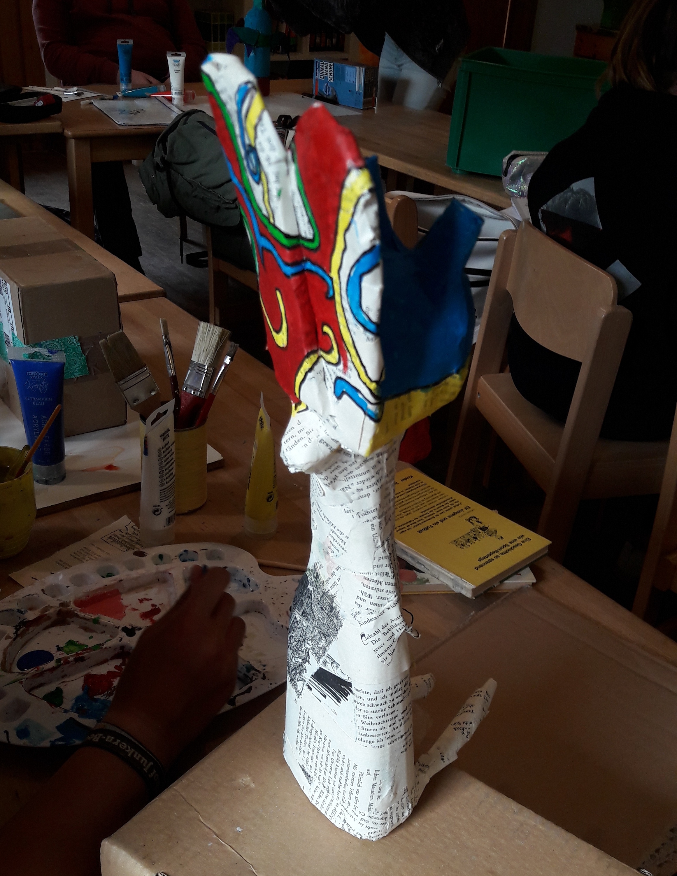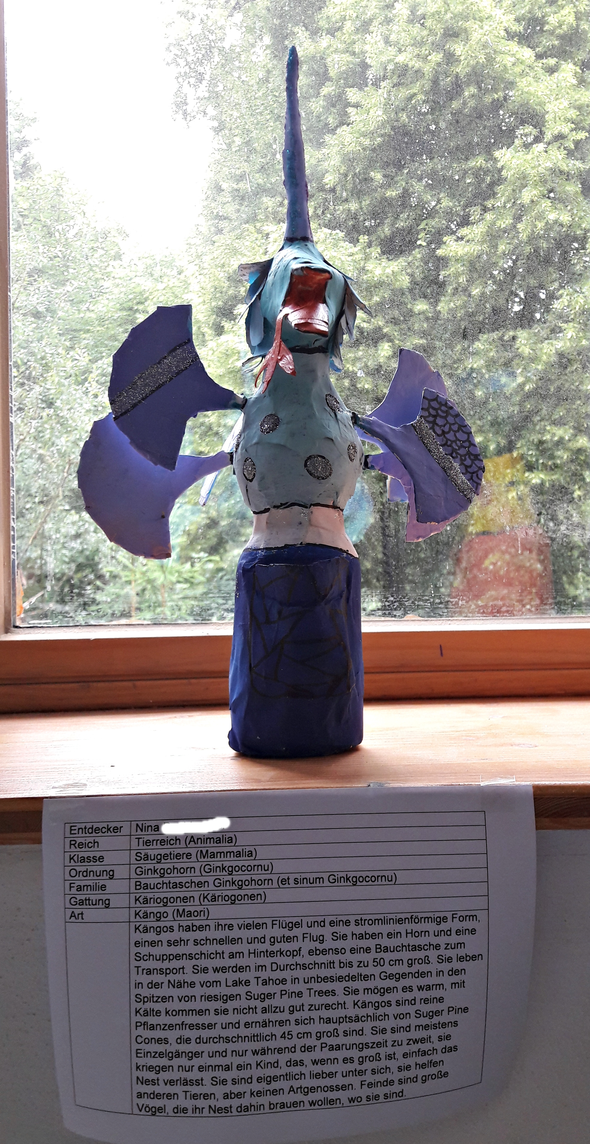 Bei der Arbeit entwickelte sich jedes Wesen zu einer individuellen Persönlichkeit und so war klar, dass in der Ausstellung auch jedes seinen eigenen Namen und Eigenschaften bekommen würde. Es war sehr spannend zu sehen, wie jede Schülerin/ jeder Schüler in die Arbeit vertieft war und sich sehr mit seinem Wesen verbunden fühlte. Jeden Tag fingen alle selbstständig und vor Unterrichtsbeginn an zu arbeiten, entwickelten schnell einen persönlichen Bezug zu ihren Wesen und hatten bald klare Vorstellungen, welche Eigenschaften und Besonderheiten es hat.