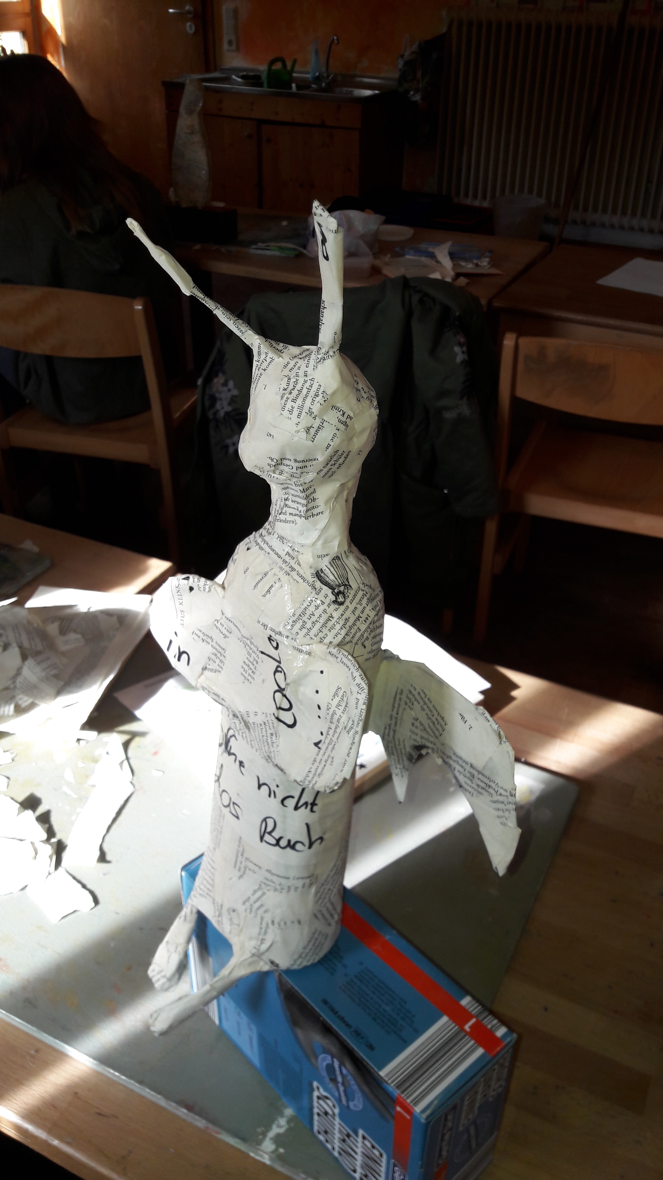 Als Basis für jede Skulptur diente eine leere Plastikflasche (Duschgel, Reinigungsmittel o.Ä.), von denen leider immer noch viel zu viele vorhanden sind. So haben sie nun die Basis für neue Werke gebildet. Mit Seiten aus alten Büchern, die weggeschmissen worden wären, und Tapetenkleister wurden die neuartigen Wesen kreiert. Nachdem die verschiedenen Körperteile (Ohren, Rüssel, Flügel, Hörner,…) kombiniert wurden, bekamen sie Farben und Muster.